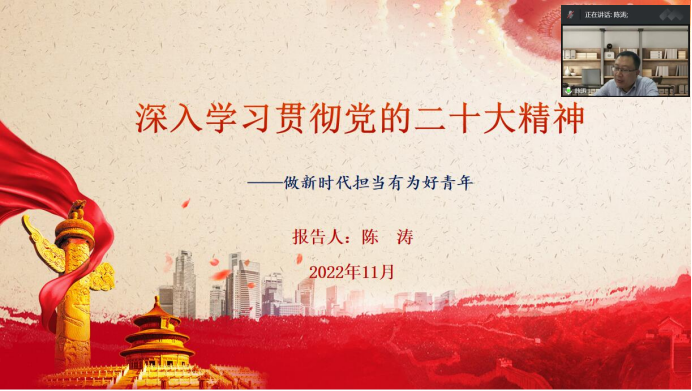 陈涛书记的报告分为党的二十大的丰富内涵和党的二十大对青年的要求两部分。陈书记深入阐述了党的二十大召开的重大意义,重点带领大家学习领会了党的二十大的主题、过去5年工作和新时代10年的伟大变革、开辟马克思主义中国化时代化新境界、新时代新征程中国共产党的使命任务、中国式现代化内涵和本质要求等内容。陈书记倡议同学们要以党的二十大精神为指引,自觉赓续红色基因,立志做有理想、敢担当、能吃苦、肯奋斗的新时代好青年,不负领袖嘱托,不负人民期待,不负时代重托,让个人成长成才的人生轨迹与中华民族伟大复兴的历史进程同频共振。