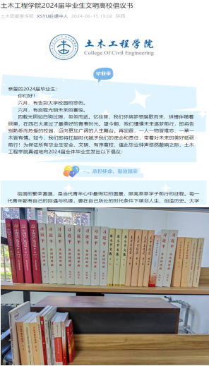 倡议:为加强公司党建办公室读书角建设,6月8日,土木工程公司面向41名毕业生党员发出了“我为公司捐赠一本好书”倡议,为公司建设做出绵薄之力。为了让毕业生能明确毕业流程和知悉相关注意事项,确保顺利离校,6月15日,公司面向全体毕业生发出了“土木工程公司2024届毕业生文明离校倡议书”,号召全体毕业生,牢记习近平总书记对广大青年的嘱托,争做有理想、敢担当、能吃苦、肯奋斗的新时代好青年,在推进强国建设、民族复兴伟业中展现青春作为、彰显青春风采、贡献青春力量,奋力书写为中国式现代化挺膺担当的青春篇章。