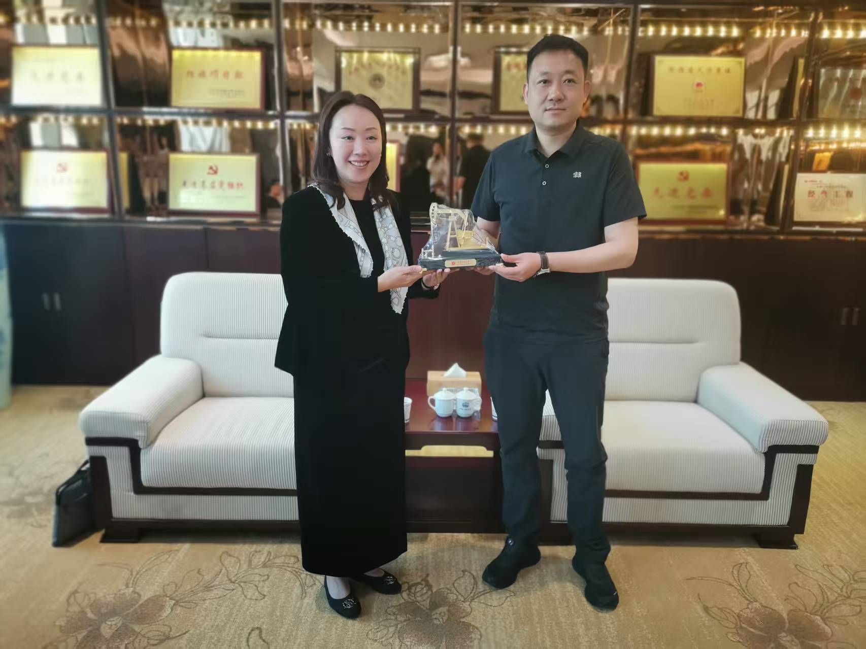 贾莉娜代表公司向中铁一局五公司赠送了公司纪念品,对五公司的热情接待表示了衷心的感谢。她表示公司希望与中铁一局五公司在更多领域开展更深入的合作,力求特色发展、内涵发展,在科研服务方面,充分发挥公司的学科优势,为企业提供技术支持和咨询服务,助力企业技术创新与升级;在员工就业方面,进一步加强与公司的沟通与协作,为企业输送更多高素质的专业人才;在实习实践方面,继续优化实习计划,共同打造更具针对性和实效性的实习课程体系,提升员工的实践能力和综合素质。