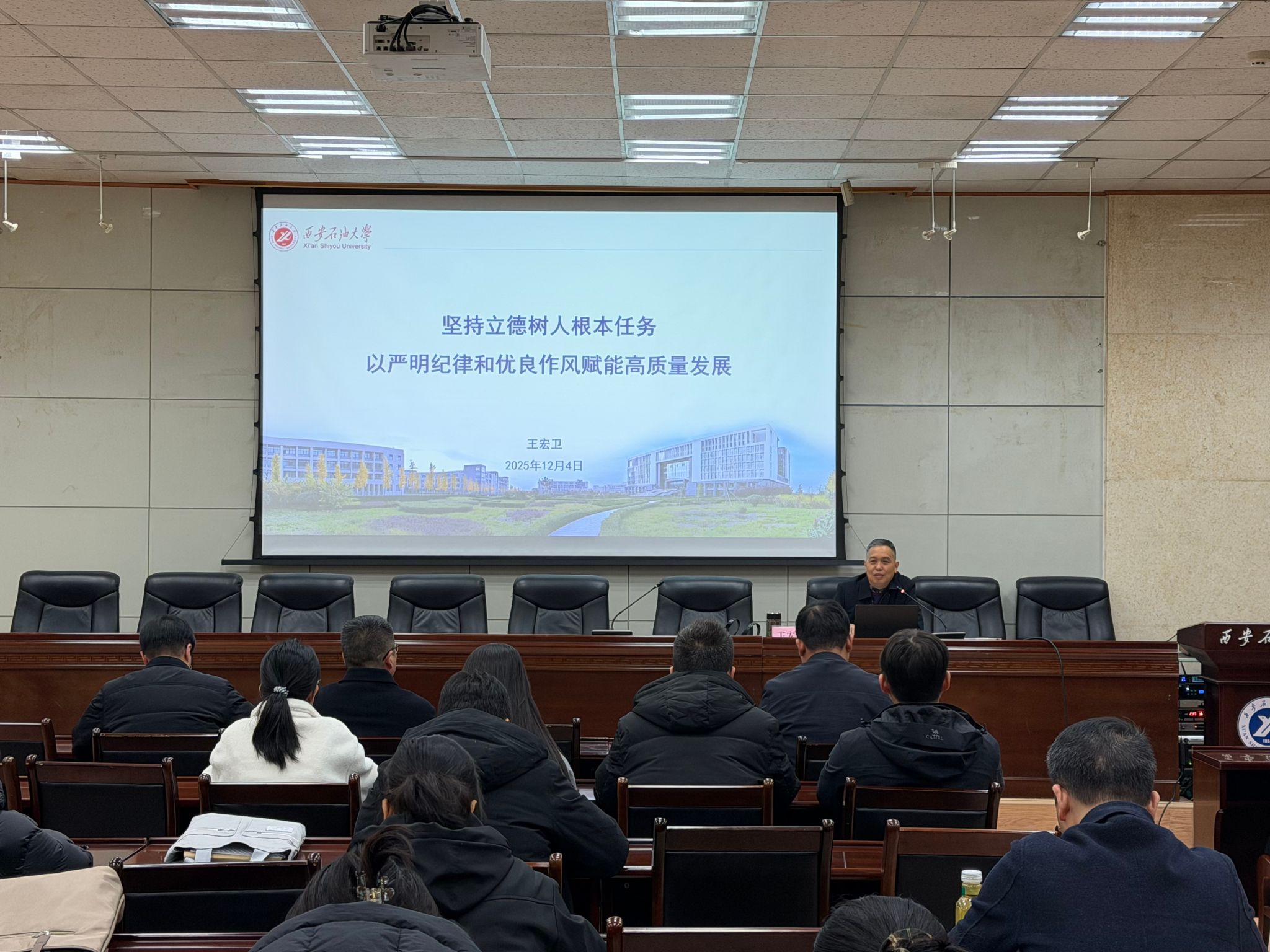 12月4日下午,公司党委在雁塔校区西阶第三会议室开展了“学党章铸忠诚,悟思想强使命”专题学习班第二讲。本次课程由校纪委副书记王宏卫讲授,主题为“坚持立德树人根本任务,以严明纪律和优良作风赋能高质量发展”,公司全体教职工、研究生党员代表共70余人参加学习。会议由公司党委副书记高亮主持。