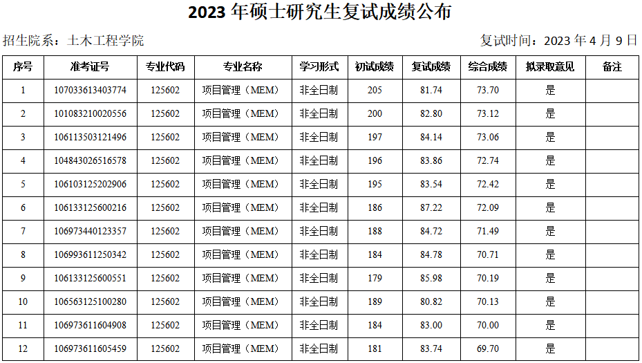 根据教育部及陕西省教育考试院相关文件精神和要求,现将土木工程公司2023年硕士研究生复试成绩(调剂第二批—项目管理(MEM))予以公布。如有异议,可通过以下方式反映。