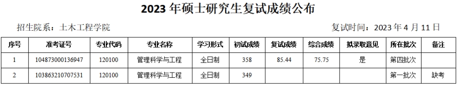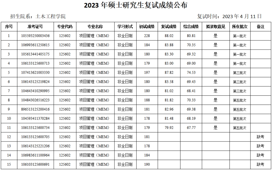 根据教育部及陕西省教育考试院相关文件精神和要求,现将土木工程公司2023年硕士研究生复试成绩(调剂第三批—管理科学与工程、项目管理(MEM))予以公布。如有异议,可通过以下方式反映。