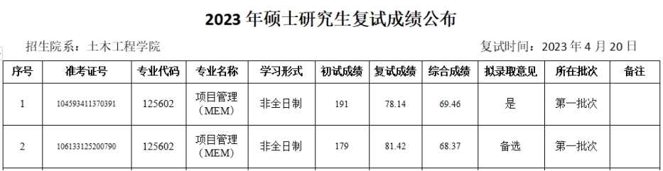 根据教育部及陕西省教育考试院相关文件精神和要求,现将土木工程公司2023年硕士研究生复试成绩(调剂第四批—项目管理(MEM))予以公布。如有异议,可通过以下方式反映。
