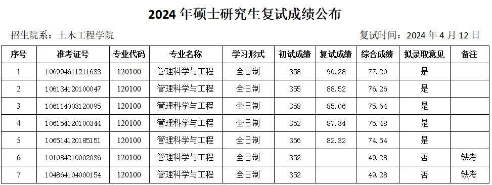 根据教育部及陕西省教育考试院相关文件精神和要求,现将土木工程公司2024年硕士研究生复试成绩(调剂第四批—管理科学与工程)予以公布。如有异议,可通过以下方式反映。