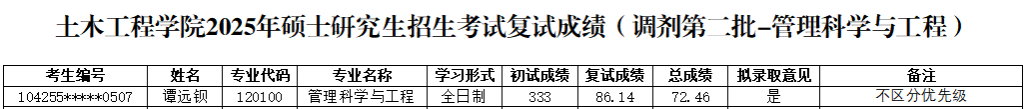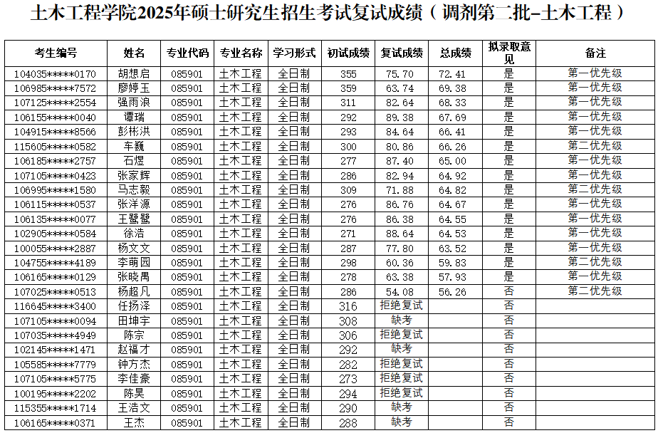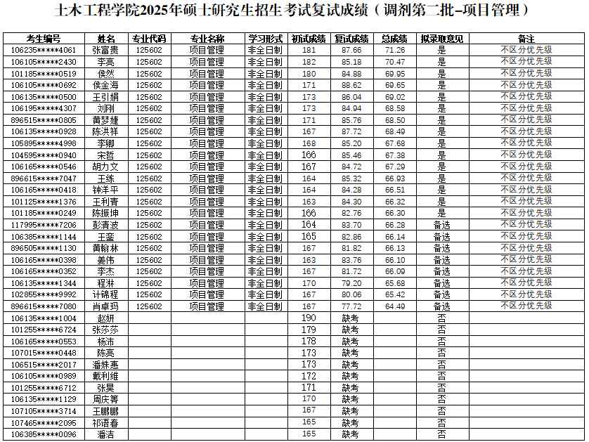 根据教育部及陕西省教育考试院相关文件精神和要求,现将土木工程公司2025年硕士研究生复试成绩(调剂第二批—管理科学与工程、项目管理、土木工程)予以公布。如有异议,可通过以下方式反映。
