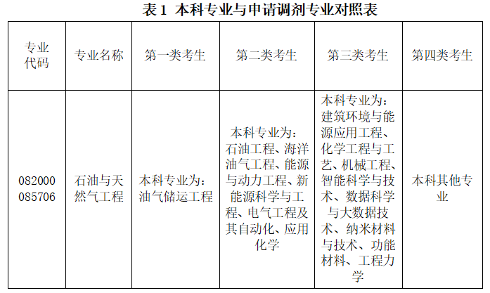 申请调剂石油与天然气工程的考生,公司将对照考生本科专业(表1),按照优先级顺序遴选调剂复试考生,同一优先级内的考生按照初试总分由高到低遴选进入复试。
