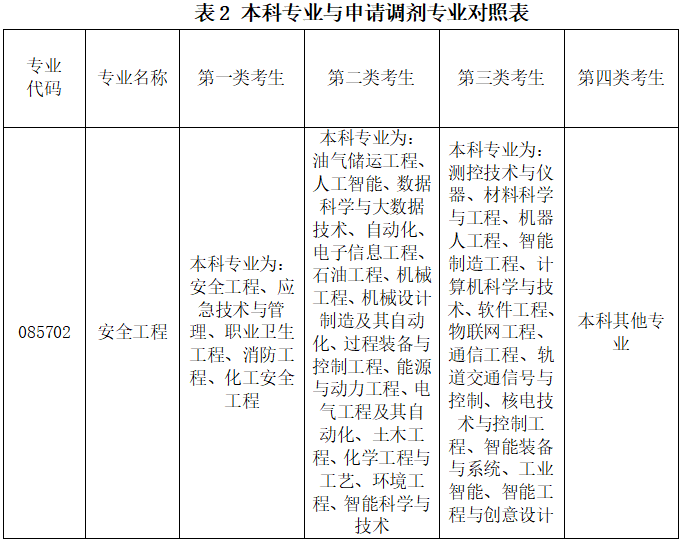 申请调剂安全工程的考生,公司将对照考生本科专业(表2),按照优先级顺序遴选调剂复试考生,同一优先级内的考生按照初试总分由高到低遴选进入复试。